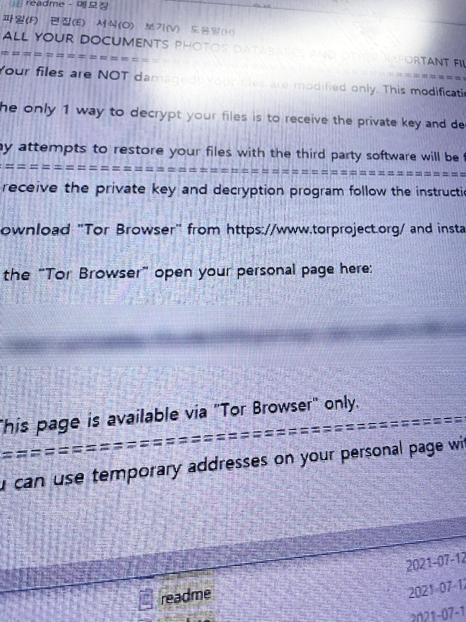 그와 더불어 배경화면이나 또는 폴더 곳곳에 내가 만들지 않은 텍스트 문서들이 곳곳에 생성이 되어있는 것 또한 보실 수 있는데요. 바로 readme 라는 제목을 가진 메모장입니다! pc파일 암호화를 풀어주는 댓가로 유포자들이 요구한다고 했잖아요? 바로 이 요구하는 사항과 그들과 거래할 수 있는 방법이 이 리드미 메모장을 통해서 알 수가 있는 것입니다.