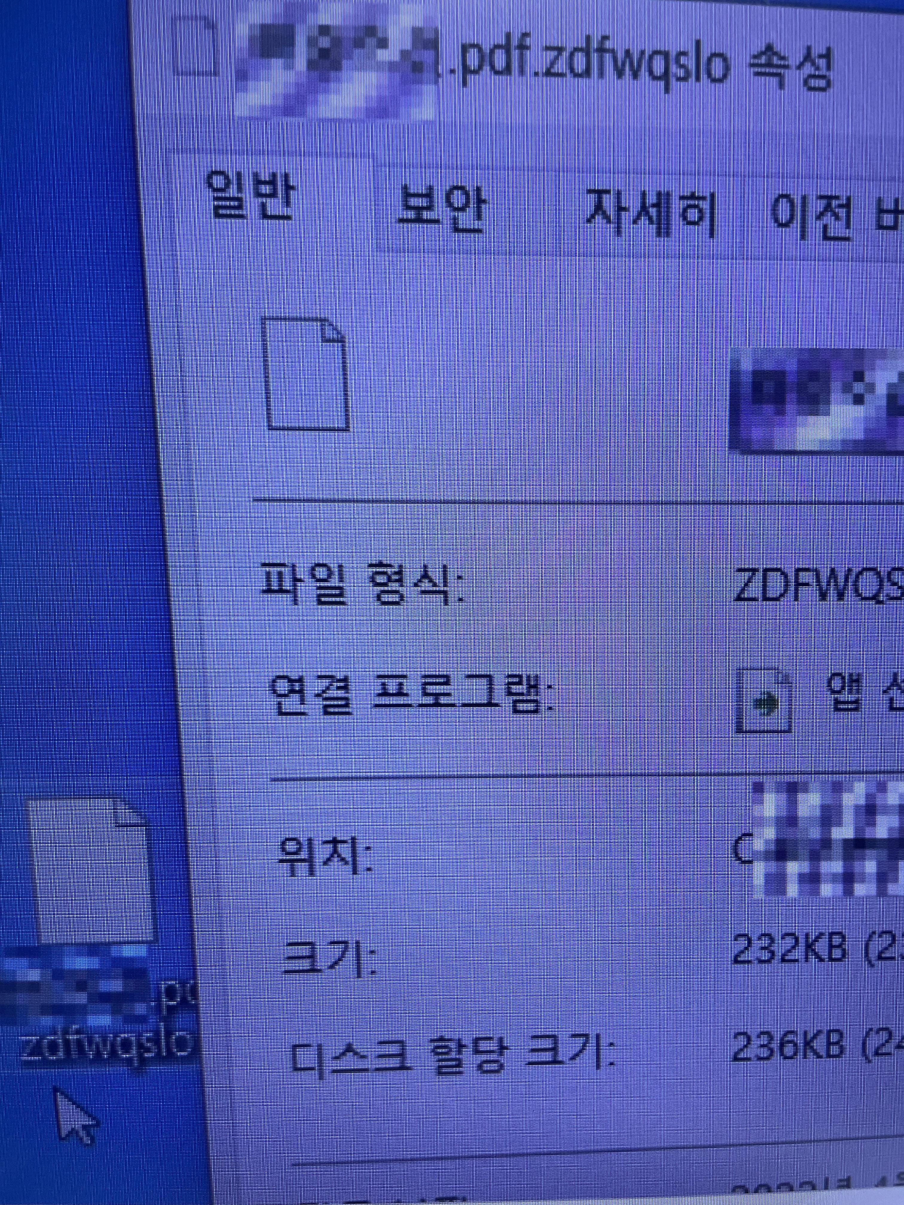 그러면 pc파일 암호화 이외도 특이한 사항이 있는지 한 번 알아보도록 하겠습니다. 일단 이 외에도 아이콘이 흰색으로 변하는 것을 볼 수 있으며 나도 모르는 영문명의 확장자가 함께 생성이 되는 것을 볼 수 있습니다. 이 영문명의 따라 랜섬웨어의 종류도 달라지긴 하지만요! 만약에 바로 확인이 안된다고 하신다면 오른쪽 마우스를 클릭해보시면 속성을 들어가서 형식에 보면 나와있답니다.