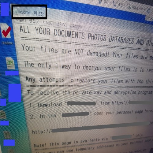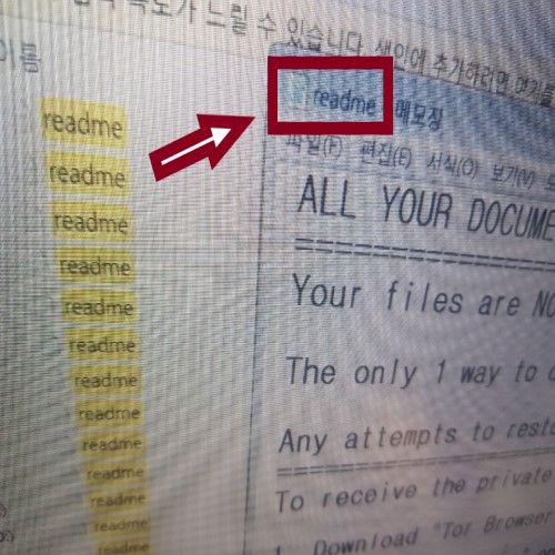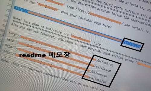 인질로 잡혀있는 데*이*터의 중요도에 따라 결정을 내리는 것이 달라질 텐데요. 만약 결정을 내리지 못하셨거나 반드시 찾아야 한다면 리드미 메모장을 확인하셔야 합니다. 복! 원! 에 필요한 과정이 적혀 있으며 이것을 삭제하시면 안 됩니다. 열리지 않는 자료들 중 유일하게 열리며 안에 내용까지 확인할 수 있습니다. 일종의 경고장으로 유포자가 남겨둔 메시지입니다. 메*모*장을 통해 어떤 종에 걸린 건지 사용자의 것을 찾기 위해서는 어떤 과정을 거쳐야 하며 원하는 대가가 얼마인지 등을 확인할 수 있습니다.