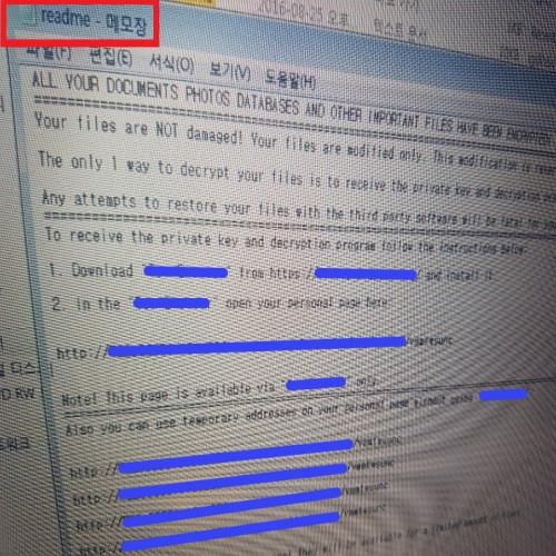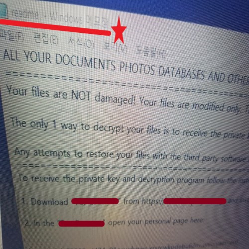 감*염이 되면 빠른 속도로 저장되어 있는 한글, 엑셀, 파워포인트, 포토샵, 사진, 동영상 등 모든 자료에 확장자를 변경시켜 잠그게 됩니다. 배포자의 목적은 금. 전. 이기 때문에 저장된 FILE을 묶어 이것을 풀 수 있는 해독키를 주는 조건으로 상당한 비용을 지불케 하는데요. 현재 무료로 복구를 할 수 있는 프로그램이 나오지 않아 잠긴 자료를 찾는 방법은 배*포*자의 요구조건을 들어준 후에야 가능합니다. 자체적으로 해결하기 위해 여러 가지 방법을 알아보시겠지만 암호화된 자료들은 반드시 키가 있어야만 정상적으로 돌릴 수 있으며 이 열쇠는 배 / 포 / 자 만이 가지고 있습니다.