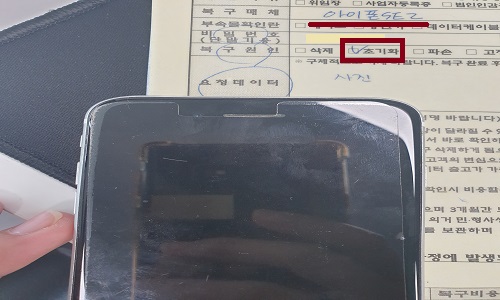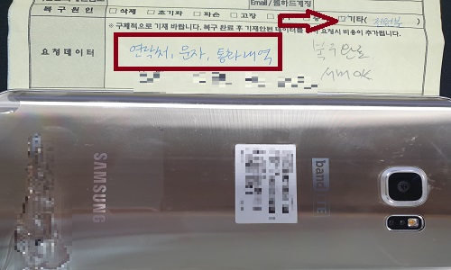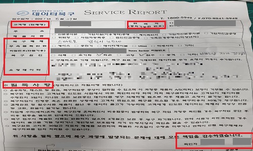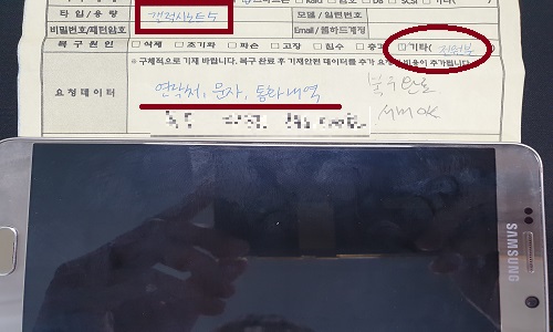 서비스센터에서는 복원을 진행하지 않기 때문에 사 설 복 구 업 체를 통해 작업을 진행하셔야 한다는 안내를 받고 저희 리 커 버 리 데 이 터를 찾아주셨습니다. 개인정보에 관련된 작업으로 사용자와 명의자가 동일하다는 서류를 준비해 내방해주셨는데요. 접수증을 작성하신 후 복원을 희망하는 항목을 꼼꼼히 체크해주셨습니다. 의뢰하신 항목은 문자복구 포함 연락처, 통화내역이셨는데요. 복원을 시도한다고 메모리에 저장된 모든 자료를 추출하는 것은 아닙니다. 개인정보에 관련된 민감한 내용이기 때문에 항목을 정확히 체크해주셔야 합니다.