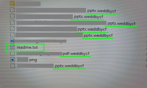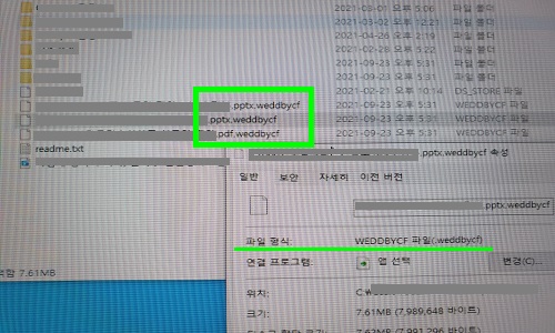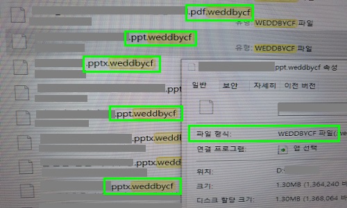 요청주신 사용자분 피씨 상태는 랜,섬,웨,어,감,염, 시 나타나는 대표적인 특징들이 보였습니다. 먼저 파,일,확,장,자,가 .pptx.weddbycf로 변경되어 있는 것이 확인되었고 이렇게 바뀐 data들은 전부 아이콘 역시 백지상태로 변해있었습니다. 또한 바탕화면과 file이 저장된 폴더마다 readme라는 이름의 메모장이 생성되어 있었는데요. 이 세 가지 증세로 ransomware 감 염으로 인해 나타난 증상임을 확인해드렸습니다.