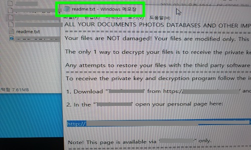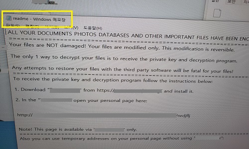 리드미 메모장은 복;구에 필요한 시간과 비[용이 기록된 중요한 문서이기 때문에 컴퓨터 랜섬웨어 해독이 필요하다면 반드시 컴퓨터에 가지고 계셔야 합니다. 삭제를 하는 것은 잠긴 자료 역시 포기하는 것과 동일하므로 주의하셔야 합니다. 또한 바뀐 확! 장! 자!를 사용자 임의대로 수정, 삭제하는 것은 물론 타사 소프트웨어로 복원을 시도하는 것 역시 주의하셔야 합니다. 이런 행동은 손상 및 원본 훼손으로 이어질 수 있어 대가를 지불한대 해도 유실될 수 있으니 주의하셔야 합니다.